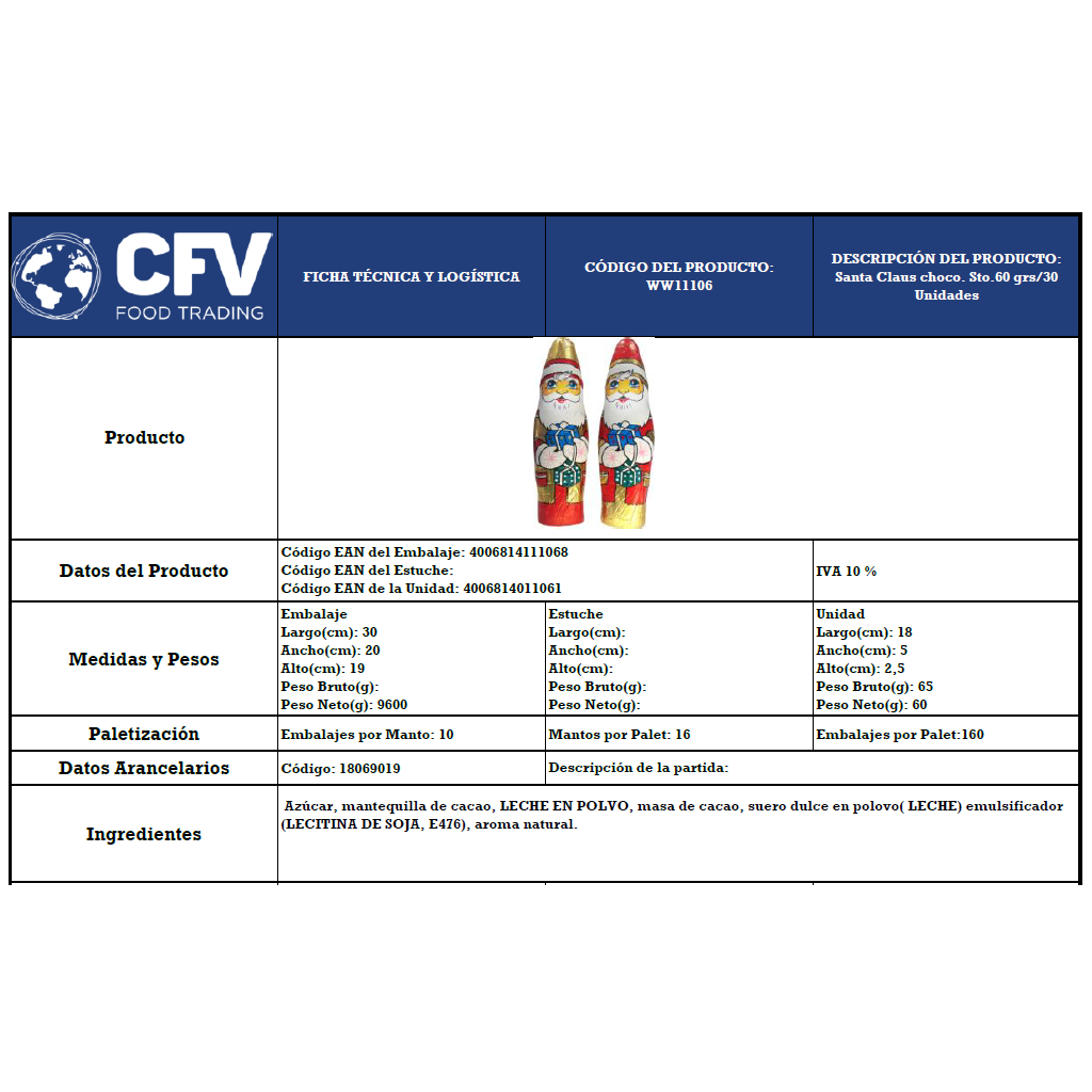 Por volumen solo se admitirá el pedido completo ya que son pocas cajas, en total 37. Las medidas de las cajas las teneis en la ficha (imagen) como embalaje. Santa Claus choco. Sto.60 grs/30ud. Fecha caducidad: 30/06/2026.